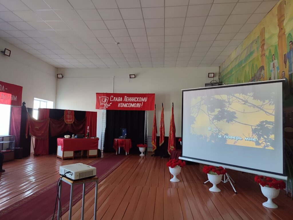викторинаҕа оонньоон кинигэ бириистэннилэр, эдэр саас, комсомол туһунан ырыалары экраҥҥа караоке ньыматынан доргуччу ыллаатылар.
